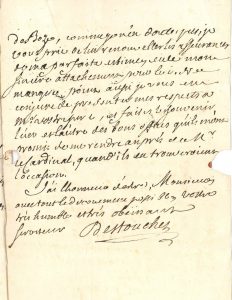 Il ajoute : « Comme ces vers ne sont que pour vous qui estes mon ami, il m’importe fort peu qu’ils soient bons ou mauvais, pourvû qu’ils vous expriment mes sentiments et ma situation presente. Au reste je vous dirai pour nouvelles que je viens d’acheter a très bon marché deux cent trente arpents de terres en frische que j’entreprends de mettre en valeur et de joindre a ma ferme » ; et il explique ses futurs travaux… Il demande des nouvelles de la « Republique des Lettres » et des spectacles, etc.