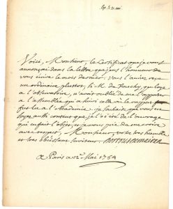 « on ne peut rien de mieux et de plus élégant, Graphicè depenxisti. Je vais profiter de l’avis »… Paris 12 mai 1754, envoyant un certificat : « Vous l’auriez reçu un ordinaire plus tôt, si M. de Fouchy, qui loge à l’observatoire, n’avoit oublié de me l’apporter a l’assemblée qui a suivi celle où le rapport fut lu à l’Academie. Je souhaite que vous en soyez aussi content que je l’ai été de l’ouvrage qui en fait l’objet »…