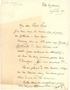prie de remettre à son secrétaire « deux exemplaires du Tome IX de Vers et Prose – id est : celui contenant mon Enfant Prodigue ! »… Villa Montmorency 6 janvier 1909. Il a bien reçu le dernier Vers et Prose sur hollande et l’en remercie. « Ouvririez-vous un N° avec ma (3 actes) Bethsabé ? – dont troisième acte inédit (paru seulement en allemand) – et dont les deux premiers parus dans l’Ermitage… qui s’en souvient ?? »…