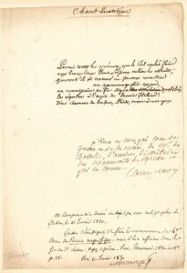Au bas de la page, attestation a.s. de Vincent Campenon sur la provenance de cette page, donnée par M. de Boitelle, d’Amiens, « dépositaire des manuscrits de Gresset » ; puis note a.s. de Louis Monmerqué (1830) expliquant que « Gresset s’étoit proposé d’en faire le commencement d’un 4e Chant du Parrain magnifique, mais il les a refondus dans le fin du 3e chant ».