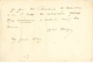 Victor HUGO. [AF] L.A.S., 27 juin 1837, à l’éditeur Eugène Renduel ; 1 page oblong in-8. « Je prie M. Renduel de remettre à M. P. Borel un exemplaire des Voix intérieures à valoir sur les miens »…