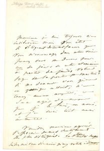 famille très honnête, a 43 ans, est d’une santé excellente ; elle n’a aucune fortune, mais est très instruite et pourrait donner des leçons de français et d’histoire… [2 février 1849], à Henry Chevreau, lui demandant de sa « loge du Théâtre de la Porte St Martin »… – Ils ont été très inquiets : « Notre cher Toto a eu une fièvre tiphoïde. Heureusement maintenant il est en pleine convalescence ». Sa jeune sœur est avec eux à Paris et aimerait se distraire de ces idées pénibles, en allant par exemple au spectacle ; elle redemande la loge de la Porte St Martin… Mercredi 21, invitation : « c’est la dernière fois que nous recevons de cette année […] Nous espérons, Monsieur, que vous nous aiderez à clore d’une manière charmante nos réunions d’amis »… – 25 mai. « Un souvenir d’ami a toujours un grand prix pour moi, surtout quand cet ami sent le besoin d’être soutenu et consolé ». Challamel lui a dit « qu’il allait publier un volume de vous, ce sera votre pensée qui nous arrivera ; nous la recevrons comme l’oiseau qui annonce l’approche des beaux jours, certainement celui qui vous rendra à la liberté, aux vôtres, sera une vraie fête, place Royale »…