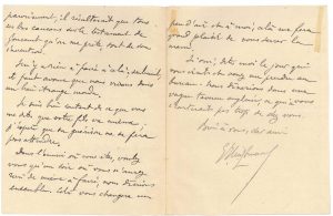 testament d’Edmond de Goncourt par ses héritiers. Il trouve sa lettre de retour d’un voyage en Hollande où il devait récupérer des documents. « Ce que vous me dites du singulier Alcibiade ne m’étonne guère. Il paraît dans le Cri de Paris des phrases où je suis désigné clairement et où l’on me fait dire d’insupportables choses. Or, de renseignements qui me parviennent, il résulterait que tous ces bas cancans sur le testament de Goncourt qu’on me prête, sont de son invention. Il n’y a rien à faire à cela, seulement il faut avouer que nous vivons dans un bien étrange monde »… 28 janvier 1907, à Fernand de Cardaillac. « Si je n’étais si souffrant et presque dans l’impossibilité d’écrire, j’aurais voulu vous remercier longuement de l’article que vous avez bien voulu consacrer dans la Revue des Hautes-Pyrénées aux Foules de Lourdes. Je veux au moins vous dire combien j’ai été touché de votre sympathie et de l’émouvante et de la vivante façon dont elle s’exprime »…