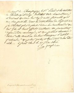 JOSÉPHINE (1761-1814) Impératrice des Français, première femme de Napoléon. L.S., Saint-Cloud 17 juin 1806, à M. de Champagny ; demi-page in-4. En faveur de Louis-Benoît Picard, directeur du Théâtre-Italien. « Le Sr Picard et les...