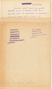 Ces feuillets sont tantôt entièrement recouverts d’écriture à l’encre violette, tantôt ils présentent quelques lignes seulement ; s’y trouvent quelques ratures et corrections. « L. exige de ses complices qu’ils ne fassent allusion jamais devant lui à certain détail sublime qui est la part qu’il se réserve dans le crime et le seul attrait qu’il y trouve »… Anecdotes fantaisistes sur des agressions sur la voie publique, distinction entre vertu et « je ne sais quel renoncement préliminaire qui dispense de vivre », passages brefs intitulés Du courage et De la fierté, et réflexions plus longues : De la hauteur, De l’ignominie.