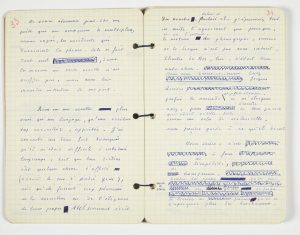 Carnets de l’Écrivain III. Liasse paginée 1 à 246. Relevons notamment : la conclusion de la section vi, telle que nous la lisons dans l’édition, figure ici à la suite du texte de la section vii (pp. 90-91) ; le schéma géométrique du Père Bourdet, décrit à la fin de la section ix, est ici dessiné (p. 108). Dans la section xi, une entrée tardive est ajoutée au crayon rouge (p. 140) ; un propos d’André Gide est resté inédit (p. 149). Une observation sur ses élèves et collègues enseignants est restée inédite (p. 168). Le texte correspondant aux sections xvi et xvii, et à la majeure partie des xviii et xix est barré ici de traits de crayon rouge, avec une entrée non retenue dans l’édition : « Je n’écris que pour moi. Si j’ai un lecteur, c’est lui qui fait tout le chemin » (p. 228).