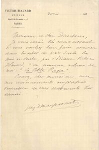 Guy de MAUPASSANT. L.A.S., [mai 1886], à un directeur de revue ; sur 1 page in-8 à en-tête Victor-Havard éditeur. « Je vous serais très reconnaissant si vous vouliez bien faire annoncer dans les échos du XIXe siècle la mise en vente, par...