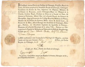 MÉDECINE. 10 lettres ou pièces, la plupart L.A.S. (divers documents joints). Paul Hirtz, Georges et René Küss, Léon Labbé, Antoine Louis (p.s., 1777), Paul Michaux, Dr Willemin… On joint une p.s. par l’administrateur Guillotin (concernant...