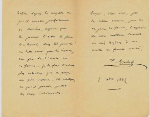 « désirerait être chargé d’une correspondance ou d’une série d’articles sur cette colonie, qu’il habite depuis la conquête et qu’il connaît parfaitement »… 3 mai 1893, à Mme Paul Redonnel, hommage d’« un fragment de poème (dont, bien entendu, le Drac n’est pas le titre ni le sujet). Quels dévirginateurs que ces directeurs de revues, fléaux du repos des poètes ! à vous néanmoins, en chimère »… 14 mars 1902, à un félibre : vœux en provençal pour le prochain congrès, à la Sainte-Estelle… 11 juin 1906, à un confrère. Il consentirait à autoriser la mise en drame lyrique ou dramatique de son Poème du Rhône, si l’on s’engageait à faire jouer la chose dans un délai raisonnable : « divers auteurs m’ont fait la même proposition, il y a 10 ou 12 ans – et puis de ce projet