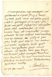 lieutenant général de Châteauneuf, qu’il regrette de ne pouvoir, en raison du mauvais temps, aller voir ; il évoque « mes deux dernieres lettres à la noblesse de Bretagne »… 23 messidor, à son « cher et obligeant patron », lui envoyant deux certificats de résidence pour le versement de ses pensions : « je compte aller faire un petit voyage en Normandie pour voir Marmontel »… 21 vendémiaire VIII (13 octobre 1799), au « cher patron », réclamant le règlement de sa pension d’Orléans pour l’année écoulée… Meulan 17 floréal, au libraire Deterville. « Je n’ai plus que 4 exemplaires du Vancouver que je puisse placer aiant disposé à l’exception de 4 ou 5 des 60 exempl. que m’a déjà délivrés le cit. Dubois la Verne et que je les ai tous placés à 60 ll sans aucune difficulté. Si le citoy. Deterville en veut placer à ce même prix il peut en envoyer chercher chés moi deux »… [An XI], à l’avocat R. de Sèze : il a hésité à « aller diner au loin le dimanche gras au hasard de manquer de fiacre […] et puis parce que les diners en ville nourrissent cette miserable gripe ». Quant à la recommandation pour Castera « je vous avoue que je ne pourrois me determiner que lorsque vous-même seres devenu mon confrere et que vous me montreres son nom ecrit sur votre bulletin »… 6 juin, au comte Roederer : sa santé « est bonne, car je dors et digère fort bien ; mais je ne puis dire que je me porte bien, car je ne me porte point du tout ne pouvant me tenir droit sur mes jambes »…