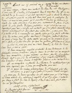 Moniteur : « Il est très important pour le succès de ce livre que cet extrait paroisse au plus tard deux jours après la publication du livre. […] Ce qui n’est pas moins important, c’est que cet extrait que j’ai fort travaillé soit imprimé correctement et surtout sans contre sens. […] J’ai des raisons pour garder exactement l’anonyme pendant huit ou 10 jours. J’exige donc de votre amitié que vous ne me nommiez à qui que ce soit, et je suis bien sûr que vous me garderez fidèlement le secret »… Puis il dresse une liste avec les références de divers ouvrages : « Je vous prie de donner vos ordres au citoyen Robert pour qu’il m’envoye ces divers articles bien collationnés complets »… On joint une quittance a.s. (10 février 1804).