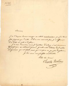 On joint une P.A.S., reçu de Renduel pour la réimpression de ses Souvenirs (1833) ; une L.S. avec le Dr A. Pichot pour la souscription d’un Essai critique sur le gaz hydrogène ; une pétition de P. Villiers apostillée par Nodier, Viennet et A. Jay (1841) ; 2 L.A.S. de sa fille Marie Mennessier-Nodier ; et 1 L.A.S. de Félix Arvers à Alfred Tattet (26 mai 1825), évoquant les fêtes du sacre de Charles X.
