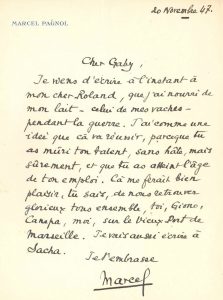 Marcel PAGNOL (1895-1974) écrivain et cinéaste. [AF] L.A.S., 20 novembre 1947, à « Cher Gaby » ; 1 page in-4 à son en-tête. « Je viens d’écrire à l’instant à mon cher Roland, que j’ai nourri de mon lait – celui de mes vaches...