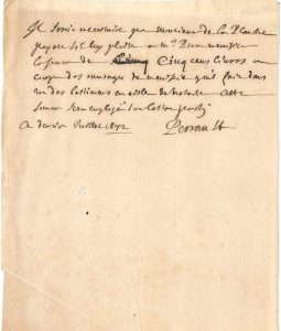 Charles PERRAULT (1628-1703) écrivain, auteur des Contes de ma mère l’Oye, contrôleur des bâtiments du Roi. [AF] P.A.S., 31 juillet 1672 ; 1/3 page in-8. Travaux de Versailles. Il prie M. de la Planche Prière de payer à Maître Prou,...