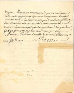 Alexis PIRON (1689-1773) poète. L.A.S., 9 juillet 1761 ; 2 pages et demie in-4 (fentes réparées au papier gommé, petits manques à un angle avec réparations). Réponse à des accusations de tentatives de corruption. Il détaille le fait...