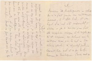 « L’émouvant envoi m’est bien parvenu, dans son tragique familier. Je vous adresse tous mes remerciements que je vous exprimerai mieux dès que je serai en état de lire le livre. Je suis en ce moment si gravement malade que, si ce n’avait été la volonté de vous remercier de m’avoir mis par ce livre en communication posthume avec Monsieur de Montesquiou – volonté qui m’a fait prendre un médicament puissant, à l’effet bref, et sans lequel il m’eut été impossible d’écrire – je n’aurais pas fait cette exception unique à la règle qui m’est imposée, non seulement par les médecins, mais par le mal – du silence absolu. L’adjectif posthume convient bien mal à ce qui touche Monsieur de Montesquiou. Jamais mort ni vivant ne me parurent si vivants ». Il sent ses forces, réveillées artificiellement, le quitter déjà ; il est si faible qu’il ne peut même pas ouvrir le journal. Il s’étonne de ne pas connaître son correspondant, qui se dit « un ami de toujours » du défunt, et tente de l’identifier : « Serait-ce par hasard vous qui le soir de la 1ère […] de St Sébastien d’Annunzio, vîntes chercher notre Maître et ami en voiture pour le ramener au Vésinet et nous déposâtes en route. Si c’est vous, je me souviens très bien et très agréablement de votre visage »… Il lui récrira bientôt car il a l’intention depuis longtemps, « de ne publier aucune étude avant celle que je veux écrire sur Monsr de Montesquiou. Or il me sera précieux à ce moment là de me concerter, fût-ce par correspondance avec vous. Moi aussi je suis un ami de toujours de Monsr de Montesquiou. Il y a bien trente ans que je fis sa connaissance. Vous ne m’en serez pas moins utile car il me manque les dix dernières années, pendant lesquelles la maladie me tint éloigné de lui. Vous avez été plus heureux, puisque vous n’avez cessé de le voir »…