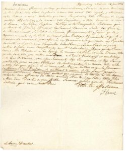 Frédéric-Guillaume III refuse de « juger des faits » d’une affaire qui regarde le gouvernement (18 septembre 1797)… Ayant pris connaissance de ses plaintes et requêtes, il a donné des ordres à M. de Voss pour le faire « recevoir pour fermier d’une petite terre dans la Prusse méridionale », s’informe de la retraite du marquis de Boufflers, et lui accorde un congé de six mois (1798-1800)… Il regrette d’avoir déjà disposé de toutes les charges de la cour de son frère le Prince Guillaume (30 août 1803)… Autorisation de terminer une affaire en France (13 octobre 1808)… En considération de ses services, transmission de la décoration de l’Ordre de l’Aigle rouge, seconde classe (6 mai 1814)… Il remercie d’une ouvrage « qui en honorant a mémoire du roi Louis XVI, rend témoignage de votre dévouement »…Etc.