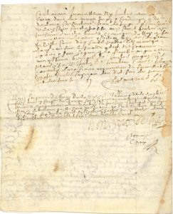 Rare document établi par le notaire Charles Blanchard, à la réquisition des sieurs Georget et autres pour l’alignement des fossé et cloture des vignes du Bueil ; il y est fait mention de l’abbaye de la Clarté Dieu… Il est approuvé et signé à la fin par Racan, « seigneur de Racan de la Roche »…