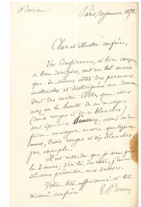 septembre 1870, pour l’envoi d’un journal à Eudore Soulié, Conservateur au Musée de Versailles. 30 janvier 1878, félicitant un « illustre confrère » sur ses « conférences, si bien conçues, si bien dirigées », qui ont un grand succès… Perros-Guirec 26 juin 1889, à un traducteur (nom gratté), au sujet de la traduction de sa Vie de Jésus : « Je serais bien heureux de voir ma Vie de Jésus en votre belle vieille langue lituanienne »…