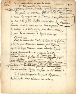 Métamorphose d’Ovide, traduites en vers, avec ratures et corrections. Ce long fragment du livre 14 narre l’entrée d’Énée dans le port de Caiète et les aventures d’Achéménide et Macarée : « Elle marche, et marchant par un sentier obscur / Le Héros sur ses pas sort de l’Averne impur /Au Dieu de la Sybille, il offre un sacrifice /Bientôt remis en mer, un vent doux et propice /Le conduit à ce port, qu’un nom cher et sacré /Le nom de sa nourrice a depuis consacré »… Etc.