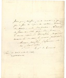 citoyen Cordier Perney la place qu’il parait mériter dans le département qu’il dirige, bien qu’il lui serait fort agréable « de pouvoir contribuer à vous assurer une existence convenable »… Paris 7 avril (1804). Il faut « ne remettre à qui que ce soit ni copie, ni extrait qu’aucun des articles de la Constitution. L’ouvrage du Sénat ne doit point être soumis à aucune espèce de discussion jusqu’au moment où il aura la grande publicité ». Il signe « le Pce de Bénévent »… Paris 14 décembre 1833. Recommandation du « Pce de Talleyrand » en faveur de M. Nicod, « ancien chirurgien, qui sollicite la décoration de la Légion d’honneur. Quoique jeune encore, il a entièrement perdu la vue. […] M. Nicod jouit d’une considération méritez pour ses travaux et pour les découvertes dont il a enrichi la science médicale, surtout en ce qui concerne la maladie de l’urètre. Il était chirurgien du Roi avant la révolution de 1830 »…
