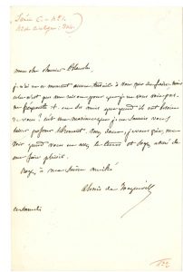 samedi : « j’aurais été vous en prier moi-même, si je n’étais en ce moment accablé d’affaires qui ne me laissent pas de loisir pour les choses qui me seraient les plus agréables ». Ils déjeuneront à 10 heures précise, car il doit ensuite se rendre à l’Académie… Samedi [21 décembre 1844], à Alfred Blanche. Il n’a aucun travail à lui confier en ce moment : « ne fréquente-t-on ses amis que quand ils ont besoin de vous ? C’est une maxime que je ne saurais vous laisser professer ». Il le prie de venir le voir…
