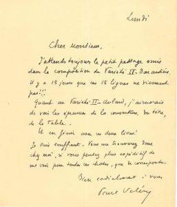 tolérer qu’il arrive en retard en cours, pour raison de santé et de soins médicaux »… Lundi [1929], à propos de la composition de Variété II : « J’attends toujours le petit passage omis dans la composition de Variété II-Darantière. Il y a 15 jours que ces 15 lignes ne viennent pas !!! Quant au Variété II-Aulard, j’aimerais de voir les épreuves de la couverture, du titre, de la table. Et en finir avec ces deux livres ! »…