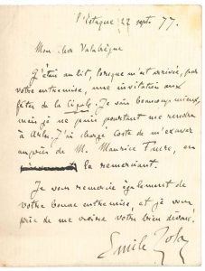 Émile ZOLA. L.A.S., L’Estaque 22 septembre 1877, à Antony Valabrègue ; 1 page in-12. Il décline l’invitation à la fête félibréenne organisée par la Cigale de Paris : « Je vais beaucoup mieux, mais je ne puis pourtant me rendre à...