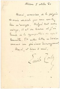 Émile ZOLA. L.A.S., Médan 5 octobre 1880, [à Ferdinand de Grammont] ; 3/4 page in-8. « Merci, Monsieur, de la poignée de main cordiale que vous voulez bien m’envoyer. Malgré tout mon courage, il est des heures où j’ai besoin de la...