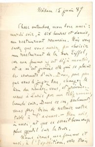 savez que vous auriez pu choisir un restaurant de la tour Eiffel, car ma femme y est déjà montée, et ce n’est jamais elle qui se plaint des courants d’air ». On peut donc changer. « Mon avis, à moi, est que ce serait beaucoup plus gentil sur la Tour. Nous irons, ma femme et moi, à l’Exposition, vers trois heures. Si, à quatre, vous voulez venir nous rejoindre, vous serez fort aimable »…