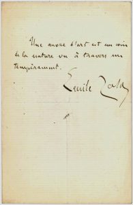 Émile ZOLA. P.A.S. ; demi-page in-8. « Une œuvre d’art est un coin de la nature vu à travers un tempérament ». Aphorisme paru dans un article du Salut public le 26 juillet 1865 (avec variante) et repris dans Mes haines, causeries...