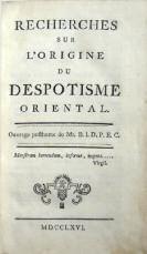 [Boulanger (Nicolas-Antoine)]. Recherches sur l’Origine du Despotisme Oriental. Ouvrage posthume de Mr. B.I.D.P. E.C. S. l., s. n., 1761. In-12, reliure de l’époque veau marbré, dos lisses orné, triple filet avec fleurons d’angle en