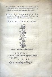 l’époque vélin à rabats (traces de liens), dos muet. Deux petits trous de vers. 347-(3) pp. En fin de volume, Variae Lectiones et Errata. Qq. rares petites taches brunes, sinon bon état intérieur. Qq. annotations en marge. Belle marque de l’impri- meur en page de titre (serpent et branche d’olivier entrelacés autour d’une lance), bandeaux et lettrines, exemplaire à grandes marges. Ouvrage entièrement imprimé en grec (hormis le titre en grec et latin) en caractères « Grecs du Roi de Garamond, dans la première fonte des caractères Gros Romain ». Edition Princeps de l’Epitome de Dion Cassius sur l’histoire romaine, composé par le moine Jean Xiphilin au XIe siècle, qui traite des années 54 à 229 de l’Empire Romain, soit de la fin du règne de Claudius et de l’avénement de Néron jusqu’à la fin du règne d’Alexandre Sévère.