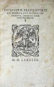 (Feyerabend), 1588. In-8, reliure vélin à recouvrement, titre à l’encre au dos. Qq. taches d’encre, vélin sali, petite fente de 3 cm en tête du mors du second plat. (4)-481-(34) ff. Belle marque typographique de l’imprimeur Feyerabend sur le dernier feuillet. Rous-seurs ou pages roussies. Ex-libris manus-crit en page de titre. Index in fine. Recueil des Œuvres de Flavius Josèphe contenant le Livre des Antiqui-tés Judaïques, De la Bataille judaïque, Contre Apion, Le Livre des Macchabées (avant-propos et traduction d’Erasme).