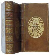 Politique des Eglises Réformées de France, tenuë à Saumur, par la Permission du Roy l’an 1611, servant de Supplément aux Mémoires… Paris, Par la Compa-gnie des Libraires du Palais, 1665. 2 volumes in-12, reliure xviiie s. veau glacé fauve, dos à 5 nerfs orné, armoiries frappées au centre des plats encadrées d’un triple filet doré. Une coiffe élimée, qq. usures sur les coins et coupes, petits trous de vers le long d’un mors. T. 1 : Titre avec vignette gravée, (6)-352 pp. T. 2 Titre, 382 pp. Qq. rousseurs, déchirure dans l’angle supérieur de 2 ff. au t. 2 avec manque du dernier mot des trois premières lignes. Exemplaire aux armes de Louis César de Crémeaux, marquis d’Entragues (1679-1747), lieutenant général au Gouvernement du Mâconnais, bibliophile, avec son ex-libris armorié sur chaque contre-garde (nom gratté). Ex-libris armorié fin xixe s. : Vicomte Ed. de Poncins. Le tome 1 contient également « le Voyage du mesme Autheur fait en Italie, Allemagne, Pays-Bas Uni, Angleterre, & Ecosse. Fait en l’an 1600 ».