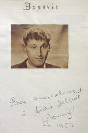 et des coupures de presse; la plupart ont été recueillis en 1953 au Casino de Deauville. Comédiens, acteurs, chansonniers, parmi lesquels : Jean Marais, Bourvil, Loulou Gasté, Pierre Fres-nay, Jl Barrault, Georges Guetary, Yves Mon-tand, Maurice Chevalier, Ray Ventura, Prince Ali-Khan, Denise Grey, Josephine Baker, Line Renaud, Yvonne Printemps, Madeleine Robin-son, Annie Cordy, Gilbert Bécaud, Les Frères Jacques, Jean Nohain, Brassens, Mouloudji …, et bien d’autres moins connus, ont laissé une simple signature et parfois quelques mots.