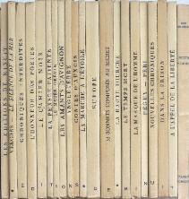 fendillés. Volumes en bon état, quelques dos légère-ment brunis et rares petites taches ou traces de doigt. * - Le silence de la mer par Vercors, nom de plume de Bruller; é : Chroniques Interdites par Paulhan, Ponge, Vercors…; D : L’Hon-neur des poètes par Éluard, Aragon,Gallois, Ponge…; I : Le Cahier Noir par Forez, pseu-donyme de François Mauriac; T : La pensée patiente par Thimerais; I : Le Musée Grévin par La Colère, pseudo. d’Aragon; O : Les Amants d’Avignon par Laurent Daniel, pseudo. d’E. Triolet; N : Angle-terre par Argonne, pseudo. de Jacques Debu-Bridel; S : Contes d’Auxois par Auxois, pseudo. d’Édith Thomas; * : La Marche à l’étoile par Vercors, nom de plume de Bruller; D : Europe par Aragon, Seghers, Desnos, Lei-ris, Éluard, etc.; E : 33 sonnets composés au secret par Jean Noir, pseudo. de Cassou; * : La Haute Fourche par Vivarais, pseudo. de Pierre Bost; M : Le Temps Mort par Minervois, pseudo. de Claude Aveline; I : La Marque de l’Homme par Mortagne, pseudo. de C. Morgan; N : Deux voix françaises par Péguy - Péri; U : Nouvelles Chroniques par Gide, Chamson, Morgan, etc.; I : Dans la prison par Cévennes, pseudo. de J. Guehenno; T : à l’appel de la liberté par Hainaut, pseudo. de Georges Adam; + Nuits Noires par Jean Steinbeck + Historique & Bibliographie par Jacques Debû- Bridel (sur papier bleu). Ensemble réunissant les textes clandestins publiés entre 1942 et 1944 par les édititions de Minuit, tiré à 1590 ex. pour l’étranger et 3735 ex. pour la France dont celui-ci, un des 3500 ex. sur vélin. Bon état général.