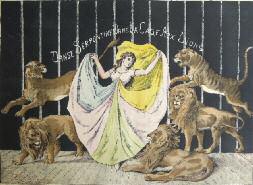 Cirque. Danse Serpentine dans la Cage aux Lions. s. d. Illustration en couleurs (29,2 x 40,2 cm à toutes marges). Petites taches (patafix) en marge aux quatre coins. Très bon état. Encadrée. La danse serpentine fut créée à New York en 1892 par