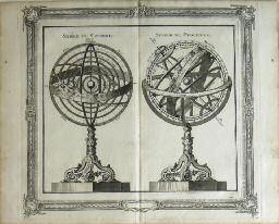 Astronomie. [Brion De La Tour]. Réu-nion de deux planches gravées : Sphère de Copernic. Sphère de Ptolémée; Sphère Droite. Sphère Parallèle (vers 1780). Gravure à double page (30 x 37 cm à toutes marges) représentant les globes dans un
