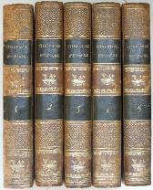 reliure de l’époque veau mar-ron glacé, dos lisse orné, pièces de titre et de tomaison maroquin vert, roulette dorée en encadrement sur les plats, tranches marbrées. Qq. épidermures, un trou de ver au dos du tome 3. T. 1 : (4)-clx-386 pp. et un tableau dépliant. T. 2 : (4)-244-283 pp. T. 3 : (4)-511 pp. T. 4 : (4)- 552 pp. T. 5 : (4)-498-xxxviii pp. Qq. rousseurs, petite galerie de vers en marge interne sur les premiers ff. du tome 1. Sans l’atlas. La première édition est parue l’année précédente.