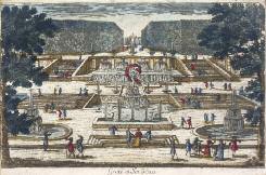 Vue D’optique. Réu-nion de 2 vues d’optiques xviiie s. • Versailles : Grote (sic) et Jet d’Eau. 17,5 x 26,2 cm. Découpe au ras des traits latéraux. Coloris anciens. • Veüe et Perspective du Val de Grâce, Couvent de Religieuses. 20 x 30