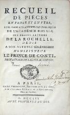 [La Rochelle]. Collectif. Recueil de Pièces en Prose et en Vers, lues dans les Assemblées publiques de l’Académie Royale des Belles-Lettres de La Rochelle … Paris, Thiboust, 1747-1752. 2 volumes in-8, reliure de l’époque veau marbré, dos à 5