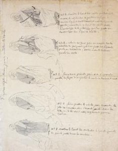 Dessin original. Figures Explicatives pour mettre le Voile. S. d. Dessin à la plume et à la mine de plomb (20,4 x 26 cm) représentant en cinq étapes un homme instal-lant son voile avec les légendes explicatives. Pliures, fine déchirure sur 2 cm