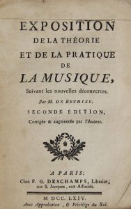 BETHIZY (M. de). Exposition de la théorie et de la pratique de la musique, suivant les nouvelles découvertes. Paris, Deschamps, 1764. In-8 de 16-331-4 pages et 60 pages de musique gravée, brochage de l’époque.Seconde édition corrigée et...