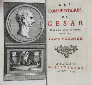 CESAR. Commentaires d’une traduction toute nouvelle. La Haye, J. Swart, 1743. 2 tomes de 154-412-514-[36] pages, reliés en 1 fort volume in-12, veau marbré, dios à nerfs orné (Reliure de l’époque).Traduction française de Perrot...