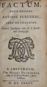 [FURETIERE (Antoine)]. Factum pour Messire Antoine Furetière, abbé de Chalivoy, contre quelques-uns de l’Académie Françoise. Amsterdam, Desbordes, 1685. In-12 de [2]-160 pages, velin moucheté (Reliure de l’époque).EDITION ORIGINALE RARE....