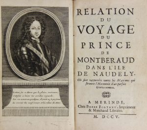 [LESCONVEL (Hervé Pezon de)]. Relation du voyage du Prince de Montberaud dans l’île de Naudely. Merinde, P. Fortané, 1705. In-12 de [50]-383 pages, veau marbré, dos à nerfs orné (Reliure de l’époque).Voyage imaginaire où l’on trouvera...