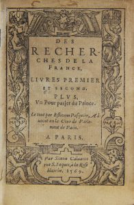 PASQUIER (E). Des recherches de la France. Livres premier et second, plus un pour parler du Prince. Paris, Simon Calvarin, 1569. In-16 de 239-16 feuillets, demi basane (Reliure du début XX°).Edition originale des premiers livres réunis dont le...