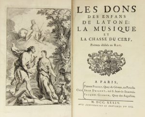 [SERRÉ DES RIEUX (Jean de)]. Les Dons des enfans de Latone. La Musique et la Chasse du Cerf. Paris, Prault, Desaint, Guérin, 1734. In-8, veau marbré, dos à nerfs orné, tranches rouges (Reliure de l'époque).« Premier ouvrage qui contienne des...