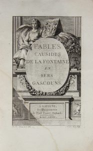 dictionnaire français-gascon est plaçé à la fin pour la lecture des fables imprimées en gascon. Dos manquant, l’exemplaire a conservé des marges d’origine.